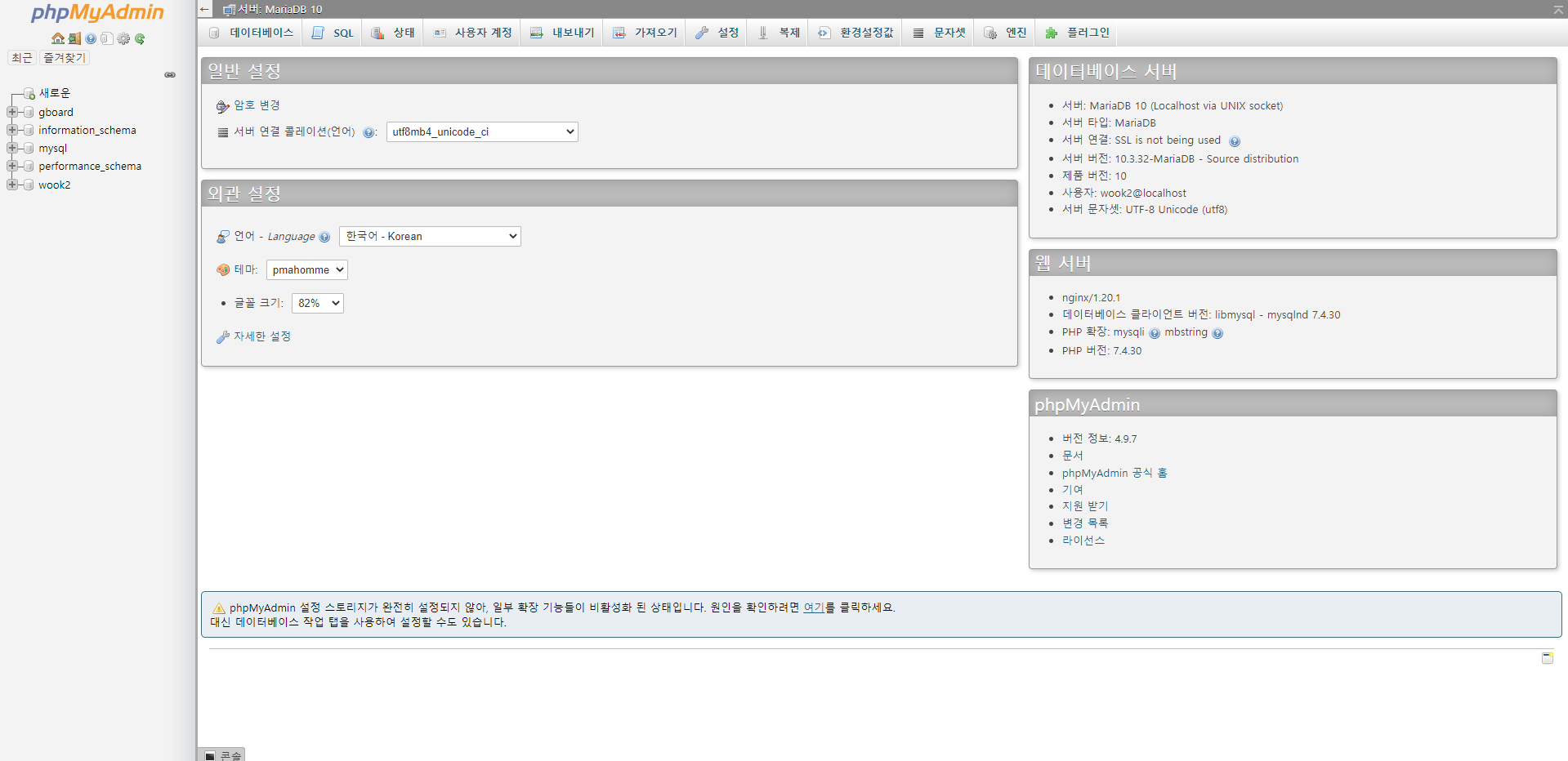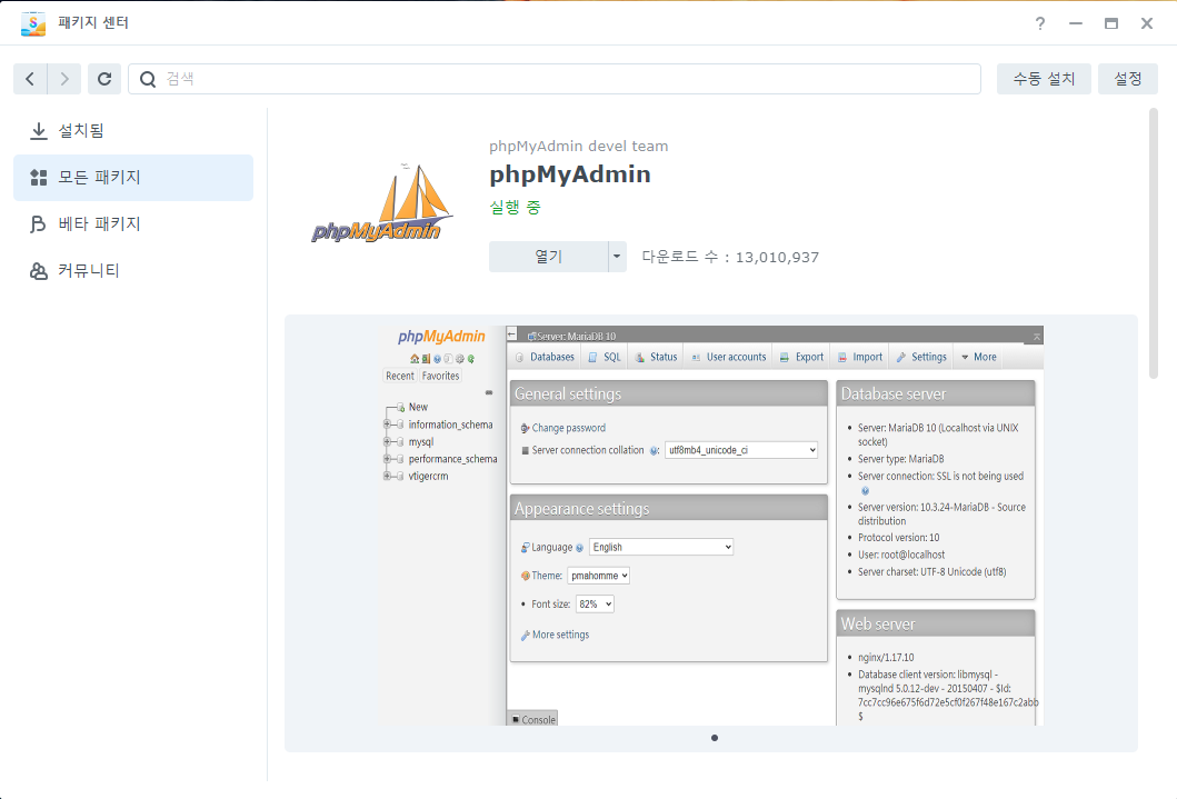 ํจํค์ง์ผํฐ > phpMyAdmin์ ์ค์น ๋ฐ ์คํํด ์ฃผ์ธ์.