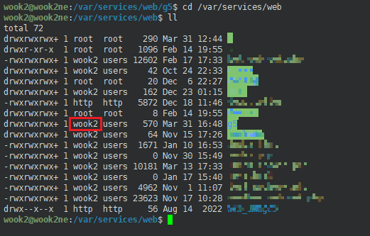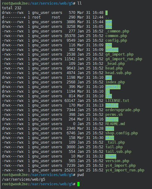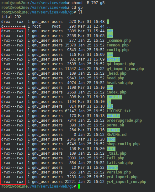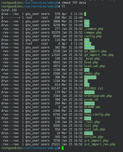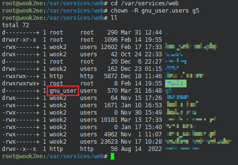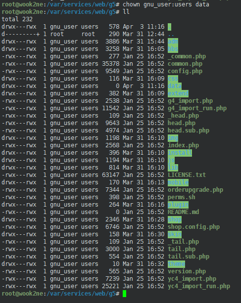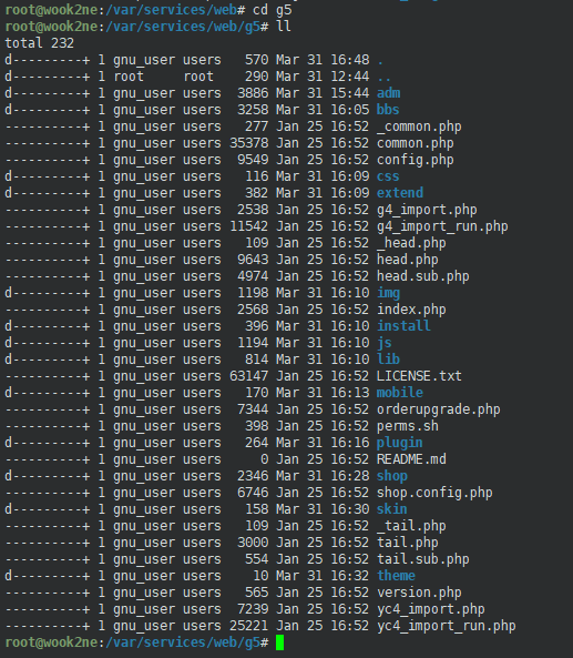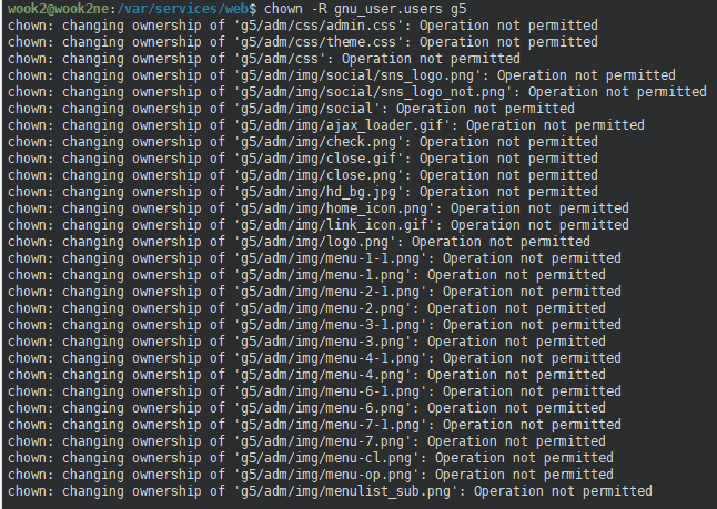 wook2 -> gnu_user๋ก g5ํด๋ ํฌํจ ํ์ ํ์ผ ๋ฐ ํด๋๋ค์ ๊ถํ์ gnu_user๋ก ๋ฐ๊พธ๊ฒ ๋ค๋ ๋ช ๋ น์ด์ ๋๋ค.