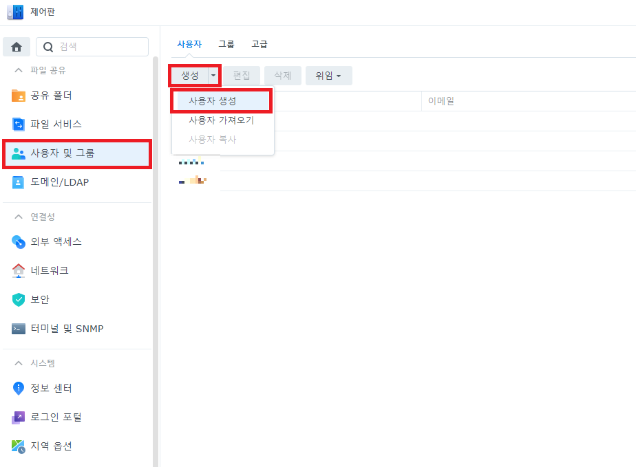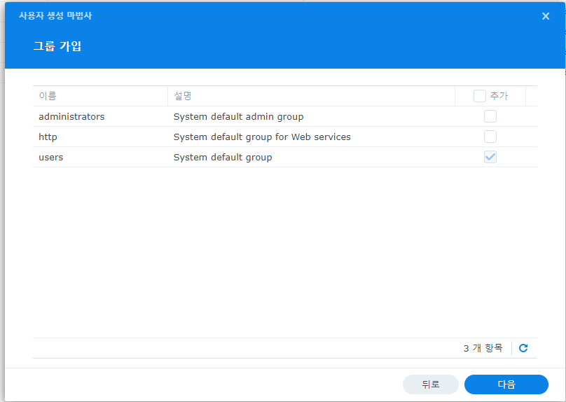 ๋ณต์ฌ๋ฅผ ๋ค ํ์ จ๋ค๋ฉด NAS์ ์ ์ดํ> ์ฌ์ฉ์ ๋ฐ ๊ทธ๋ฃน์ ๋ค์ด๊ฐ ์ฃผ์ธ์.