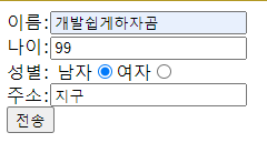 ์ฑ๋ณ: ๋จ์<input type="radio" name="sex" value="๋จ์">์ฌ์<input type="radio" name="sex" value="์ฌ์"><br>