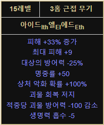 40 공속에 피해증가 방어력 무시 대상방깎 옵션에서 볼 수 있듯 상대방에게 해가 되는 옵션들로만 주로 이루어져 있어 3 소켓 클러에 작업을 많이 한다. 혼돈씬의 짝꿍으로 자주 쓰였으며 그 외에는 잘 쓰지 않는다.