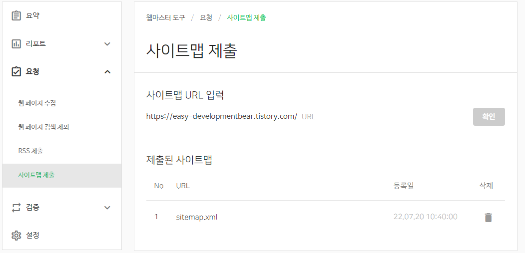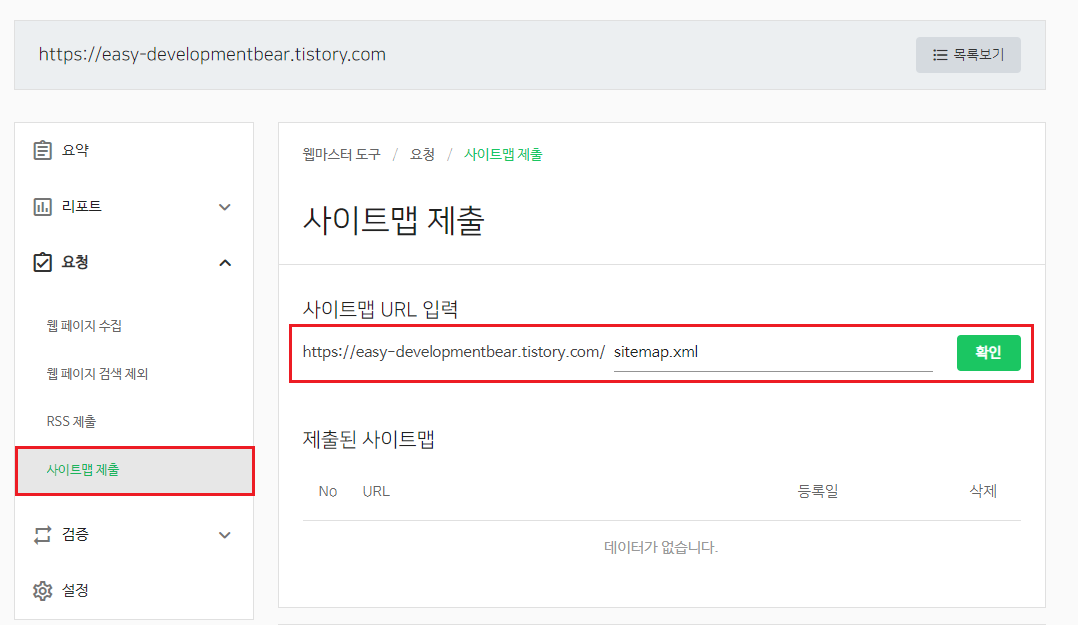 ์ข์ธก ํญ ์ฌ์ดํธ๋งต ์ ์ถ ํด๋ฆญํด์ฃผ์๊ณ URL ๋ค์ sitemap.xml ์ ๋ ฅ ํ ํ์ธ์ ๋๋ฌ์ฃผ์ธ์.