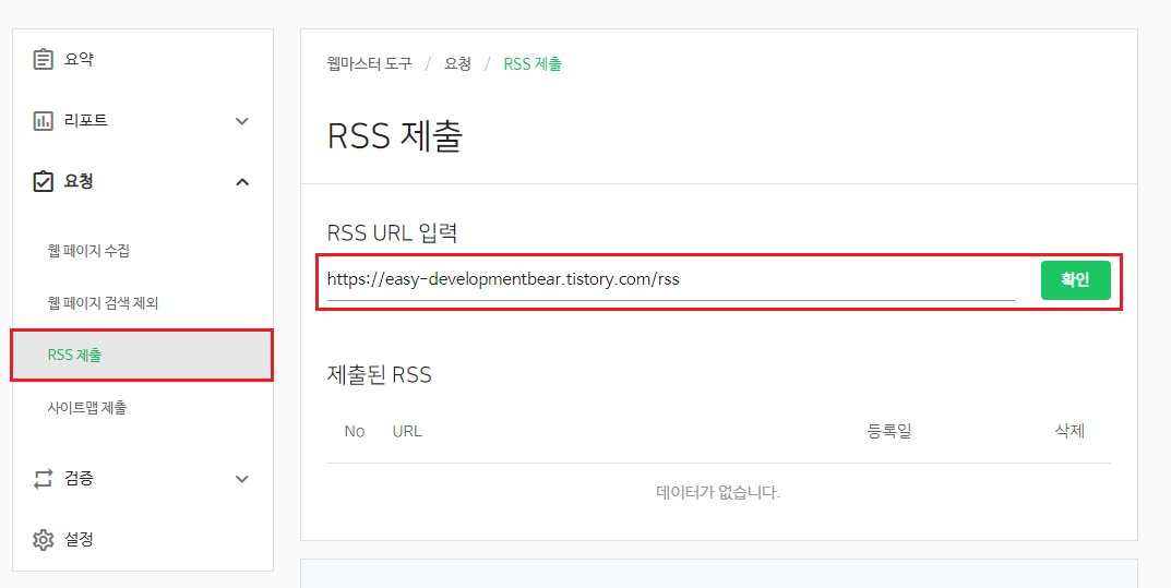 ๋ธ๋ก๊ทธ ์ฃผ์ ๊ธฐ์ ํ ์์ ๊ฐ๊ฒ rss๋ง ์ ๋ ฅํด์ฃผ์๊ณ ํ์ธ ๋๋ฌ์ฃผ์ธ์.