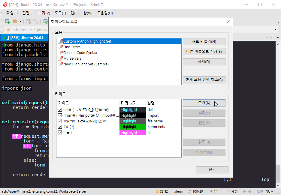 터미널에서 특정 문자열을 강조 표시할 수 있도록 키워드나 정규식을 정의합니다. 세션에 적용할 하이라이트 세트를 생성하고 관리합니다.